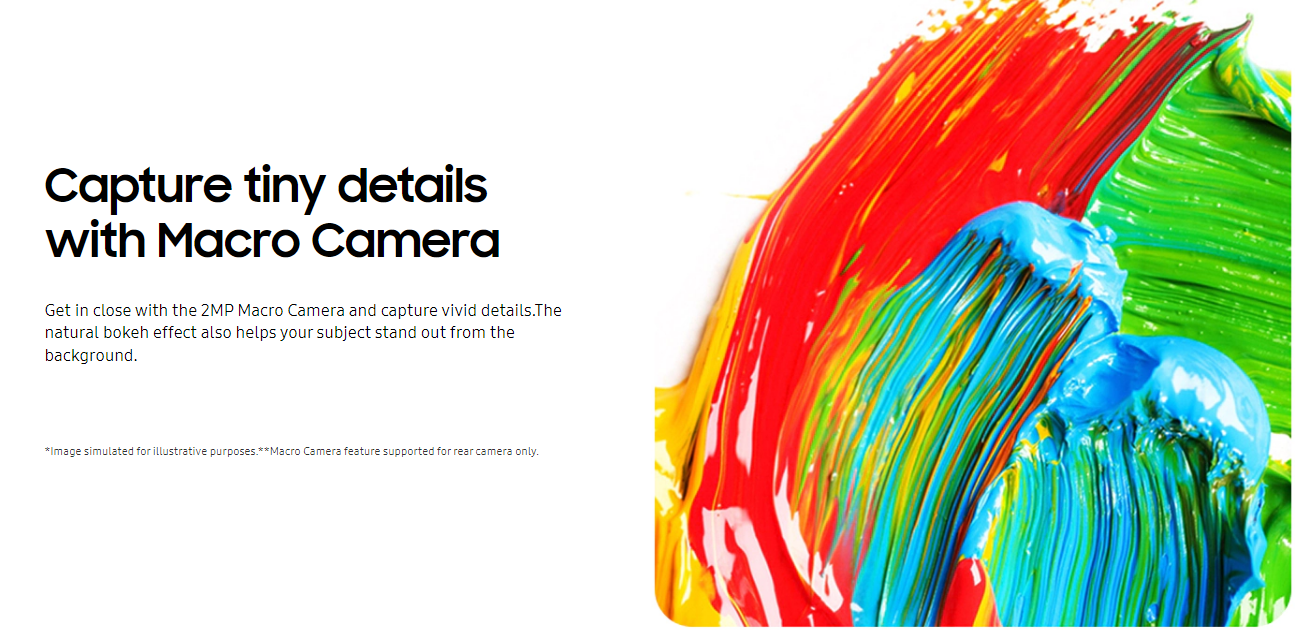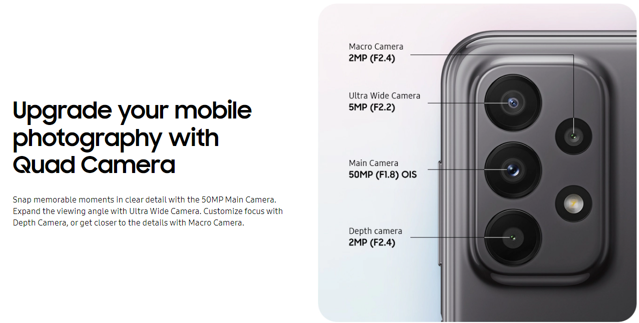 Rear Quad Camera - 50 MP, f/1.8, (wide),5 MP, f/2.2, 123˚ (ultrawide),2 MP, f/2.4, (macro),2 MP, f/2.4, (depth)
